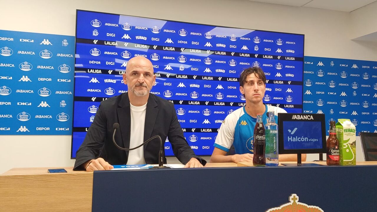 Samuele Mulattieri, junto a Fernando Soriano, el día de su presentación como jugador del Deportivo