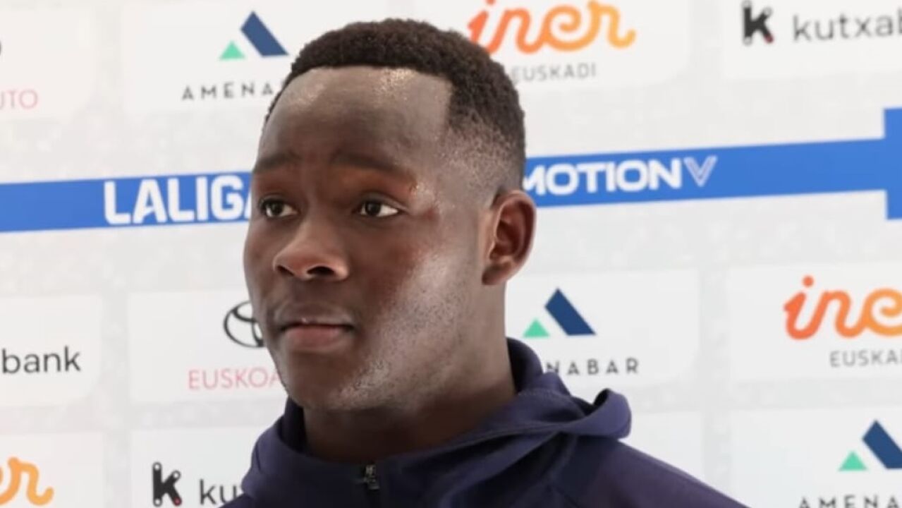 Nsongo Bil, tras anotar su primer gol con el Deportivo en Zubieta ante la Real Sociedad B
