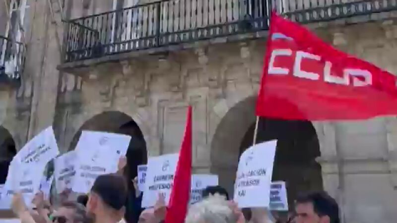 Los funcionarios del concello de Lugo se concentraron ante la Casa Consistorial para reclaman el pago de las horas extra que les adeudan, así como otros complementos. Piden que se abra una vía de negociaciones con el Gobierno Local para tratar esa asunto y otros pendientes como la actualización de la Relación de Puestos de Trabajo. Los representantes sindicales llegaron a entrar en el salón de plenos coreando distintas consignas y acusando de desleal al responsable de Personal.