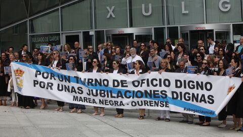 Avogados e avogadas ourensáns de "turno de oficio" manifestábanse en Ourense concluindo perante a Delegación da Xunta e apoiados polo colectivo de procuradores tras seis meses de folga em demanda de "melloras económicas, laboráis e de xubilación dignas".