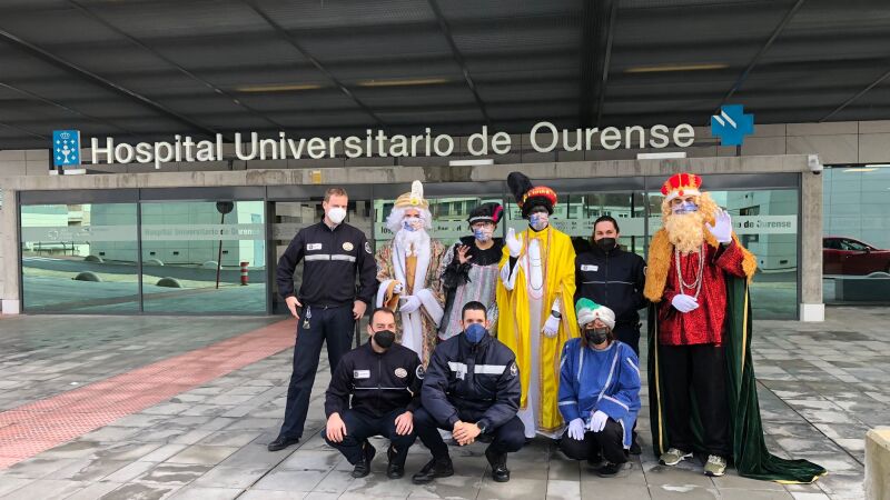 Os bombeiros axudaron ás súas maxestades a acceder ao edificio, utilizando a espectacular escaleira do camión do servizo municipal, e a dar os regalos e transmitirlles ánimos aos rapaces e as rapazas, cos seus desexos dunha pronta recuperación.