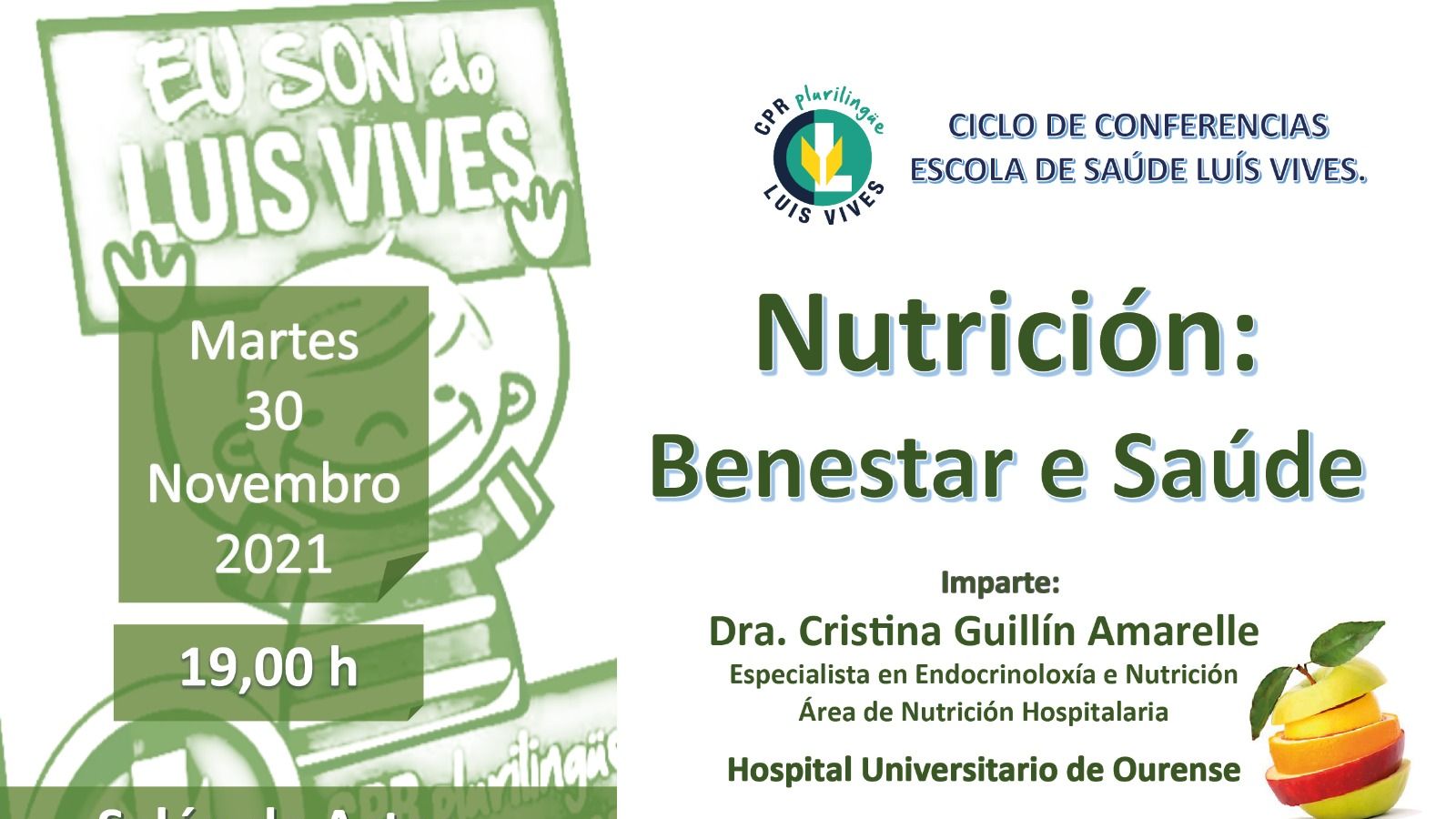 O martes 30 de novembro ás 19 horas no salón de actos Mabel Rivera do Colexio Luis Vives continúa o ciclo de conferencias, neste caso abordase o tema relacionado coa nutrición coa Doutora Cristina Guillín Amerelle, médico especialista en endocrinoloxía e nutrición do CHUO.A entrada é libre para todas as persoas que quieran asistir pertenzan ou non á comunidade educativa do centro aínda que haberá control de aforo para respectar as medidas COVID.