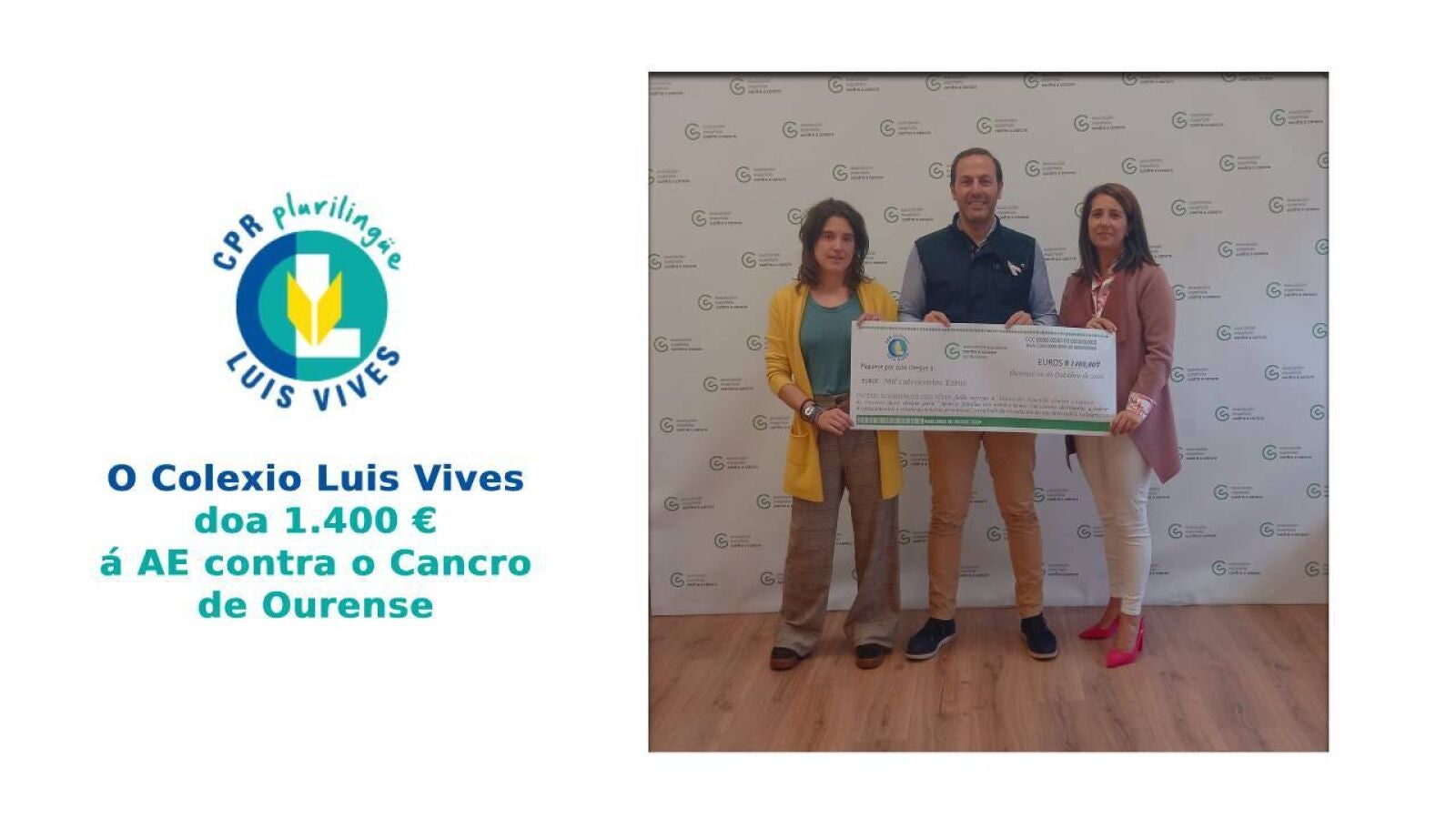 O Colexio Luis Vives de Ourense fixo efectiva a doazón de 1.400 euros á Asociación Española contra o Cancro de Ourense para o apoio ás familias con nenos e nenas con cancro destinadas a cubrir os desprazamentos e as estancias noutras provincias.