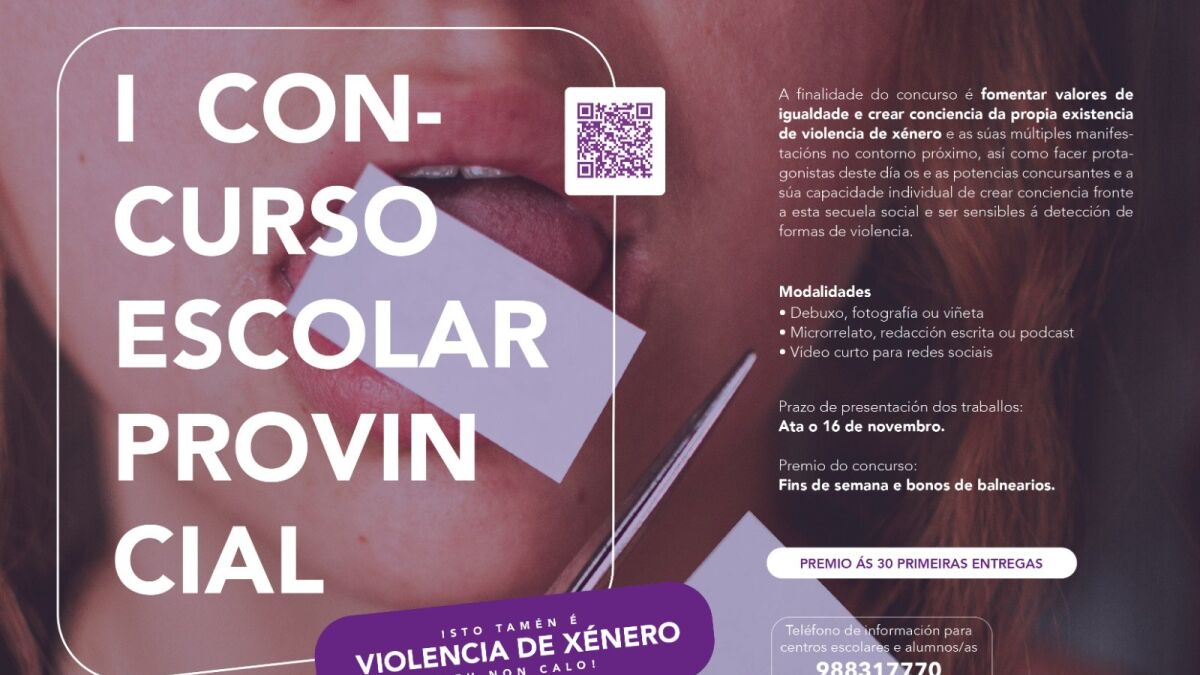 A Deputación de Ourense abre o prazo para participar no I Concurso Provincial contra a Violencia de Xénero, dirixido a centros educativos de educación infantil, primaria, secundaria obrigatoria, bacharelato e formación profesional de grao medio. A convocatoria deste certame vén motivada pola celebración, o próximo 25 de novembro, do Día Internacional contra a Violencia de Xénero.
