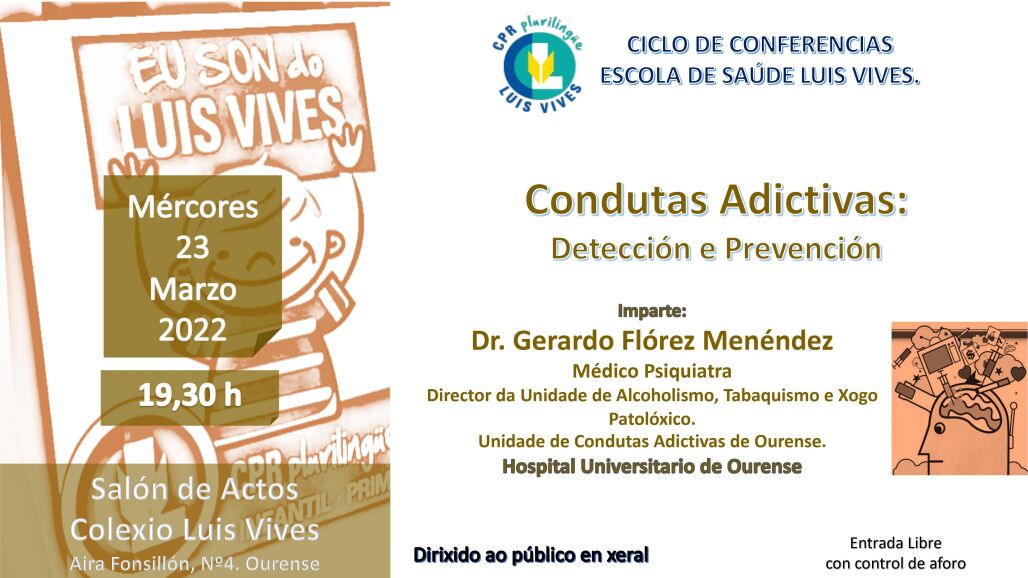 O vindeiro mércores 23 de marzo ás 19:30 horas terá lugar a IV Conferencia dentro do ciclo "CONFERENCIAS ESCOLA DE SAÚDE LUÍS VIVES" no Salón de Actos do Colexio Luis Vives baixo o título "Condutas aditivas: detección e prevención".