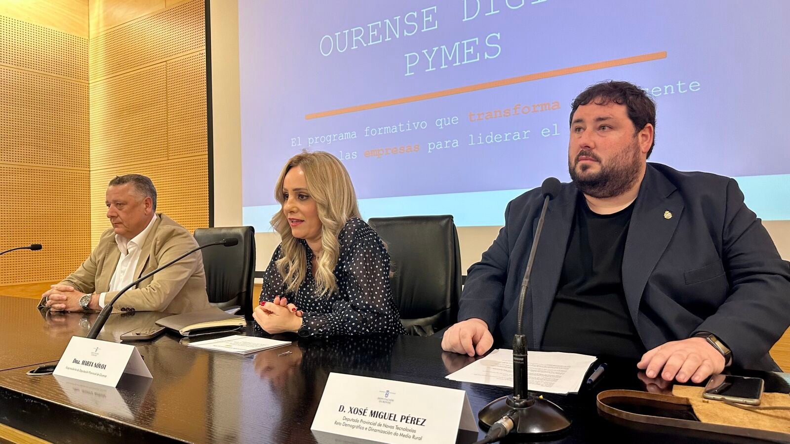 A Deputación colabora no programa formativo “Ourense Dixital Pemes” para impulsar a transformación dixital do tecido empresarial da provincia. Así o explicaron hoxe no Centro Cultural Marcos Valcárcel a vicepresidenta primeira da Deputación, Marta Nóvoa; o deputado de Novas Tecnoloxías, Xosé Miguel Pérez; e o presidente de ef Business School e do Centro de Estudos Superiores Universitarios de Galicia (CESUGA), Venancio Salcines, aos xerentes, directores e responsables de recursos humanos de pemes ourensás de entre 10 e 249 traballadores que asistiron á xornada de presentación.