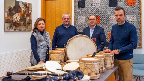 No Centro Cultural Marcos Valcárcel, a directora do colexio, María Beatriz Pascual, e o profesor de música, Alejandro Miguélez, agradeceron unha doazón que inclúe dez pandeiretas, cinco tambores, un pandeiro, un bombo e unha gaita.