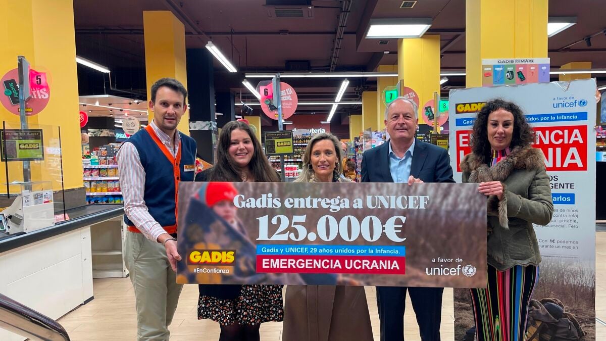 Gadis y sus clientes han recaudado 125.000 euros en la campaña de ayuda a Ucrania que la cadena de supermercados ha puesto en marcha en colaboración con UNICEF. La Agencia de Naciones Unidas para la Infancia será la encargada de gestionar esta aportación que, fundamentalmente, irá destinada a facilitar el acceso a agua potable, medicamentos, equipos médicos, kits de higiene y apoyo psicosocial a la infancia más vulnerable. Con la cantidad económica recaudada UNICEF puede facilitar agua potable a 328.498 niños y niñas.