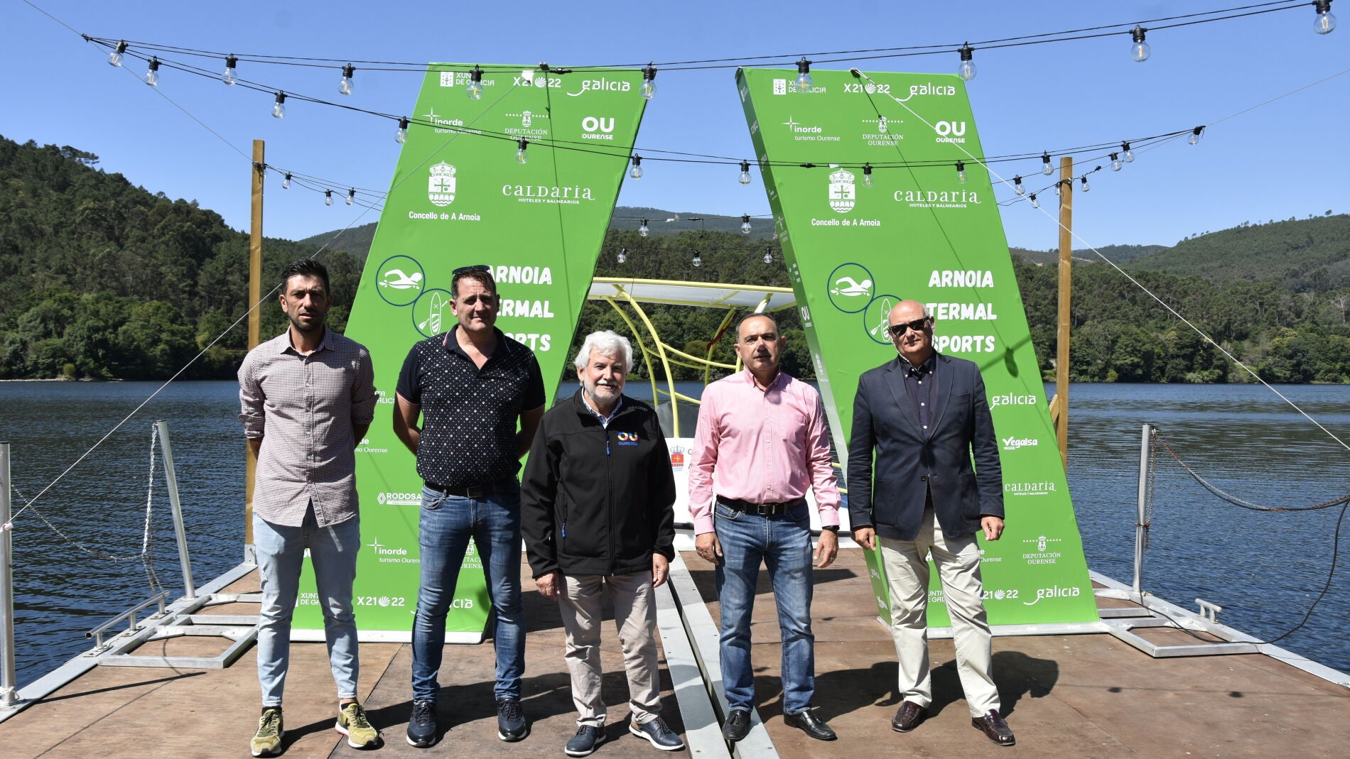A natación e maila incorporación do pádel surf como novidade son os deportes que protagonizarán esta próxima fin de semana -9 e 10 de xullo- a segunda edición da Arnoia Termal Sports, que co apoio da Deputación de Ourense reunirá a máis de 150 deportistas en augas do río Miño e situará á contorna termal deste concello como punto de referencia turístico-deportivo. Unha cita que foi presentada esta mañá no pantalán de Arnoia coa presenza do vicepresidente primeiro da Deputación, Rosendo Fernández; o alcalde, Rodrigo Aparicio; o xefe provincial de Deportes da Xunta en Ourense, Manuel Pérez; o xerente de Caldaria, Javier Soto; e o director técnico da proba, Serafín Martínez.