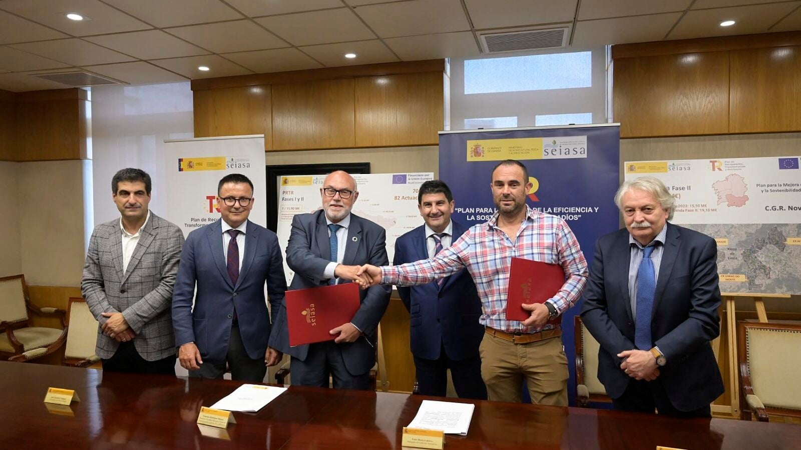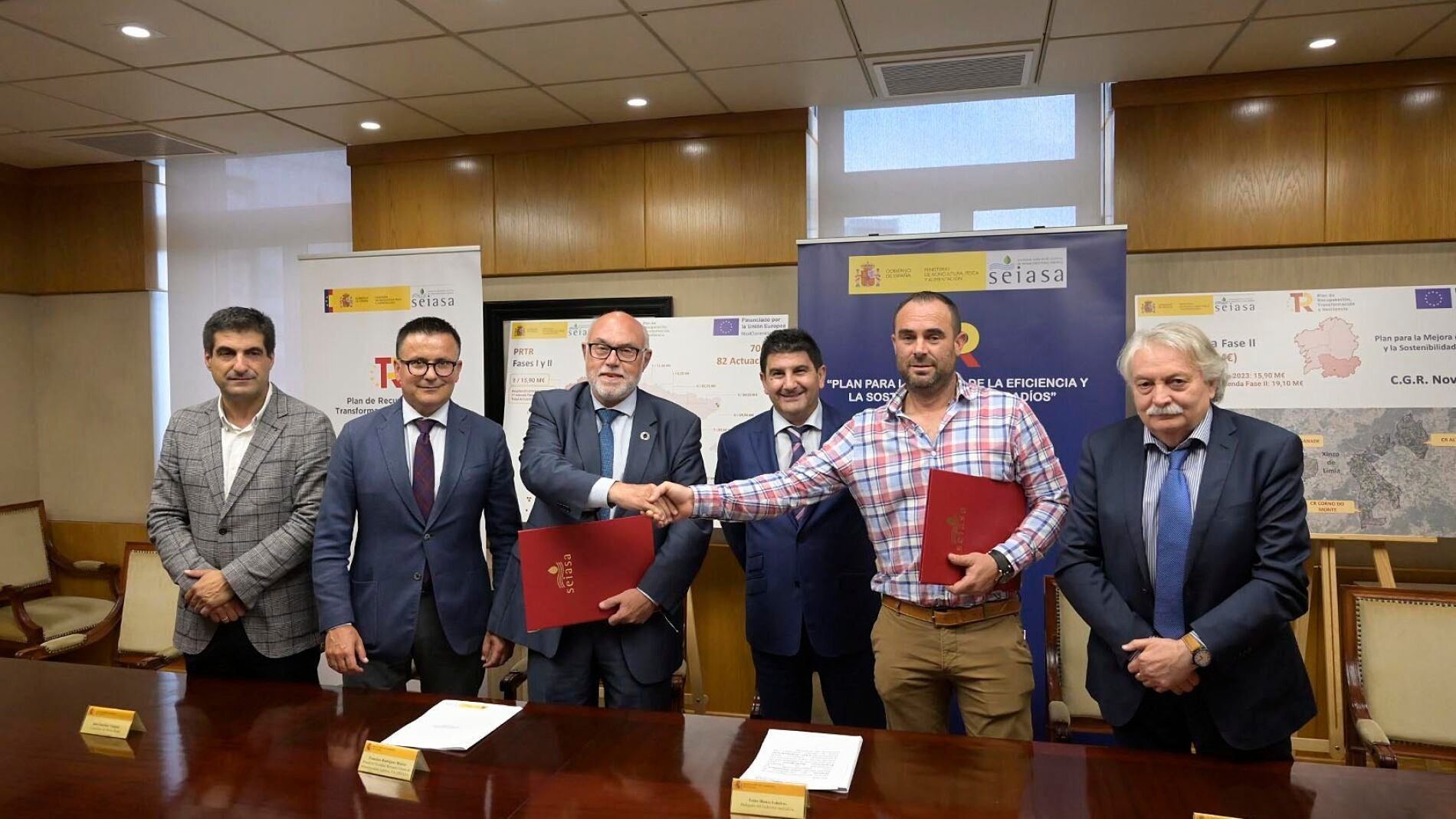 O conselleiro do Medio Rural, José González asistiu á sinatura do convenio entre a Sociedade Estatal de Infraestruturas Agrarias (Seiasa) e a Comunidade de regantes “Nova Limia” para levar a cabo o proxecto de mellora para o aproveitamento en regadío das 40 captacións de augas subterráneas - A Limia 2022, que conta cun orzamento total de 16 millóns de euros (o 80% deste orzamento financiado polo Goberno central e o 20% restante polas comunidades de regantes). Alí, o conselleiro celebrou a posta en marcha desta colaboración para a mellora e modernización deste regadío, que comprende unha superficie de 4.105 hectáreas distribuídas en 6.964 parcelas de 3.342 propietarios, ao tempo que recalcou o compromiso da Xunta con esta modernización.