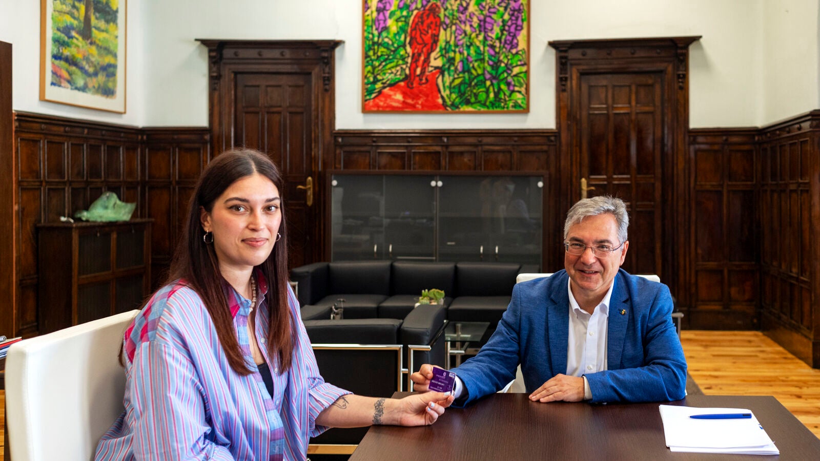 O presidente da Deputación de Ourense, Luis Menor, fixo entrega esta mañá no Pazo Provincial, da “tarxeta 8M”, dotada con 1.134 euros, á primeira beneficiaria do programa “EmprendOU en feminino–8M” co que a institución provincial promove o emprendemento feminino en zonas rurais da provincia.