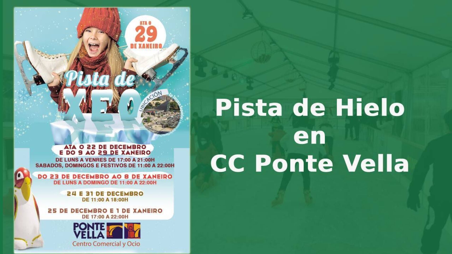 A pista de xeo de CC Ponte Vella está situado, por terceiro ano consecutivo, na terraza superior accesible desde a pranta de ocio de Ponte Vella a través do ascensor ou de escaleiras mecánicas.