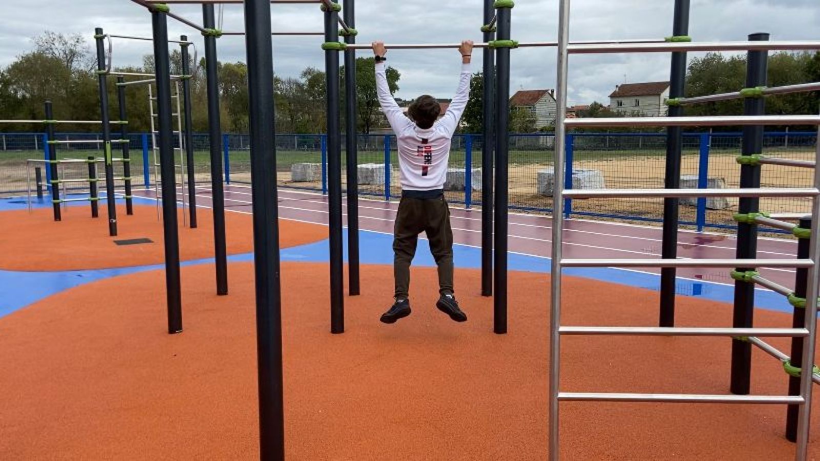 Máis polo miúdo, a zona deportiva exterior dispón dunha zona de saltos, dous elementos de workout, e tres calles de atletismo de 21,60 m de lonxitude, dispostos sobre unha soleira de formigón, previamente elaborada, con pavimento de caucho continuo nos espazos de caída dos dous elementos de workout e pintura deportiva no resto dos espazos e finalmente delimitado por un valo metálico de grella pintado en cor azul.