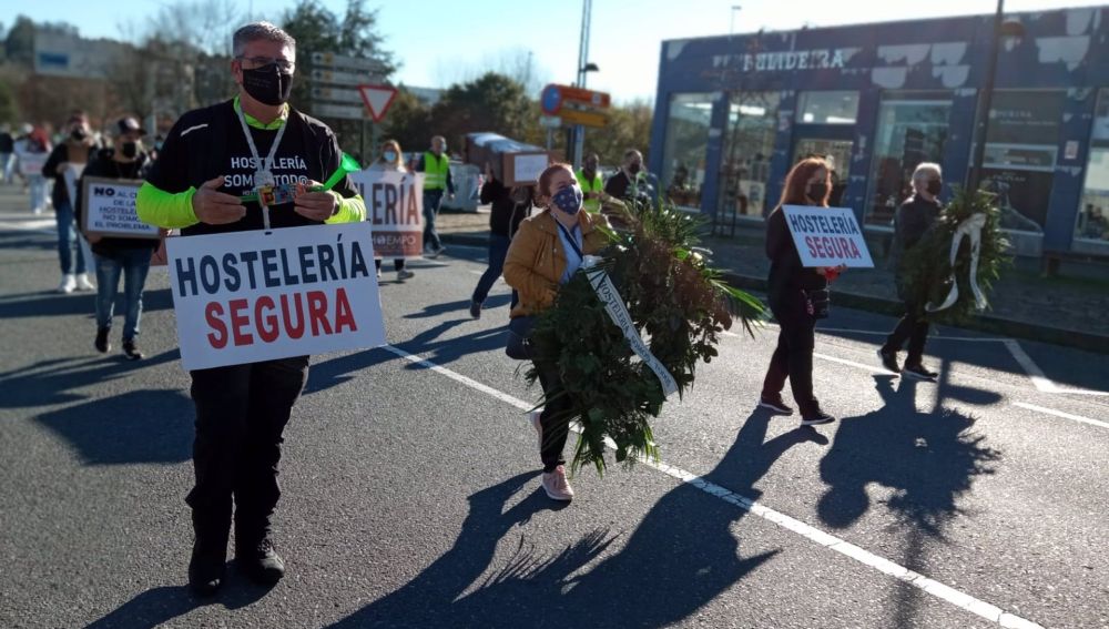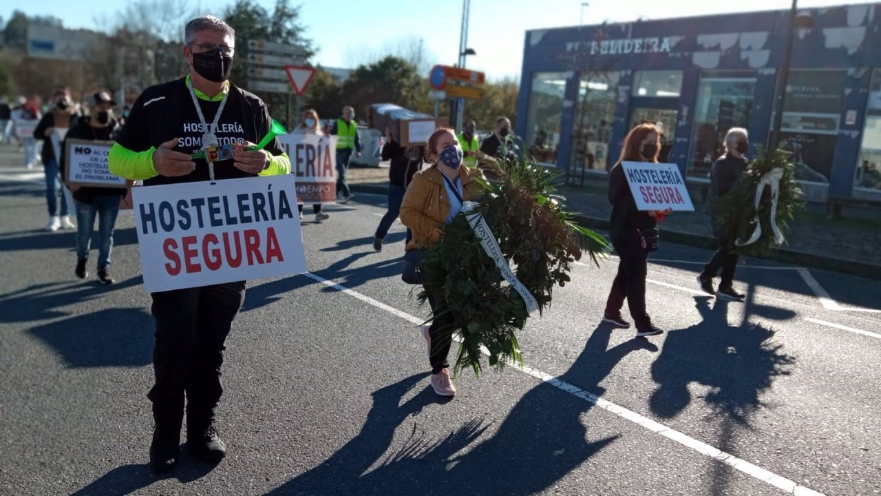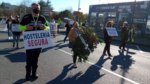 "Plan de rescate xa. Salvemos o emprego da hostelería galega". Es la reivindicación en una marcha que estaba precedida por una banda de tambores y en la que se ha reivindicado la seguridad de los negocios y pedían volver a abrir. Algunas personas portaban coronas funerarias y un féretro.