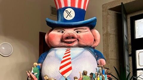 El 'meco' que este Carnaval recorrerá las calles compostelanas fusiona al presidente de los EE.UU., Donald Trump, y a uno de sus principales asesores, Elon Musk, también propietario de la red social 'X' bajo una nube que representa el universo de las redes sociales y a los pies de esa figura, atrapados en una red, multitud de personas sin rostro.