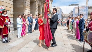 Tras los discursos, las dos Corporaciones salieron a los balcones de Raxoi para escuchar las actuaciones de las bandas de música municipales de las dos localidades.