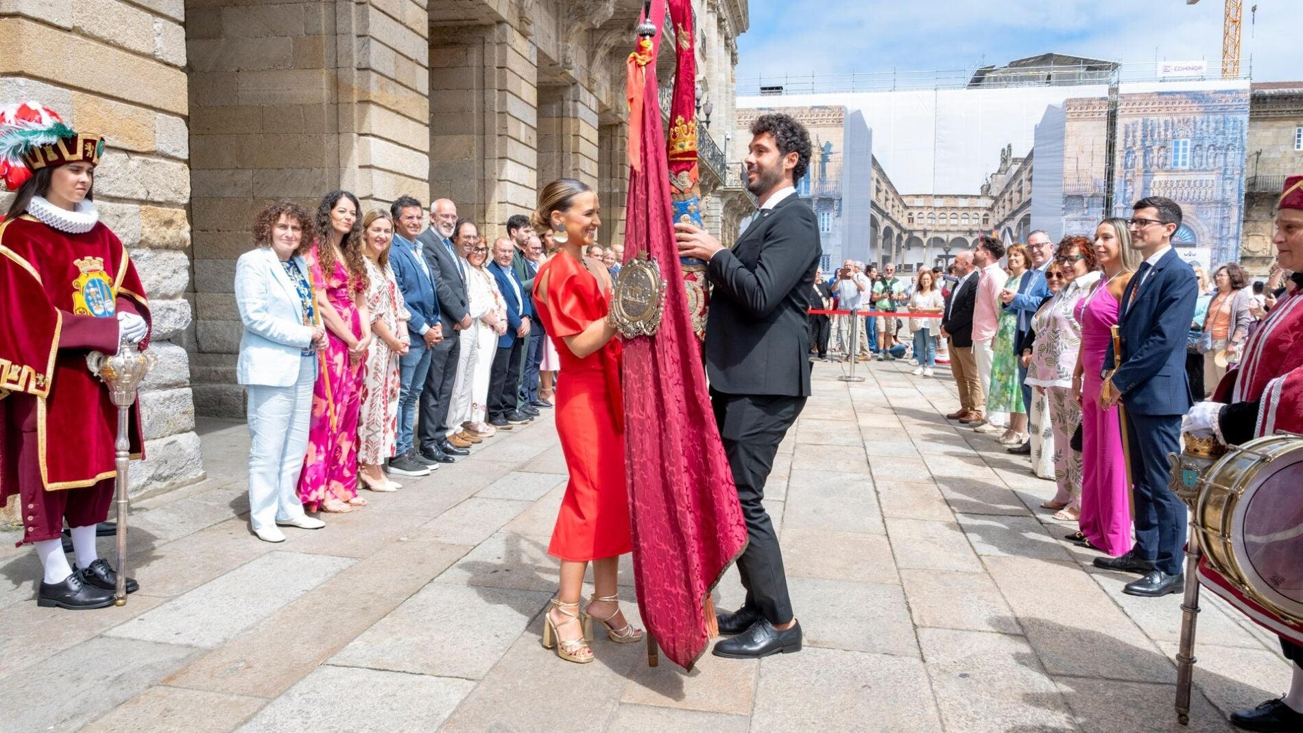 La Corporación Compostelana recibió a su patrona en la Plaza del Obradoiro, donde los alcaldes intercambiaron bastones y se saludaron formalmente. A continuación, los representantes municipales de ambos municipios se dirigieron al Pazo de Raxoi.