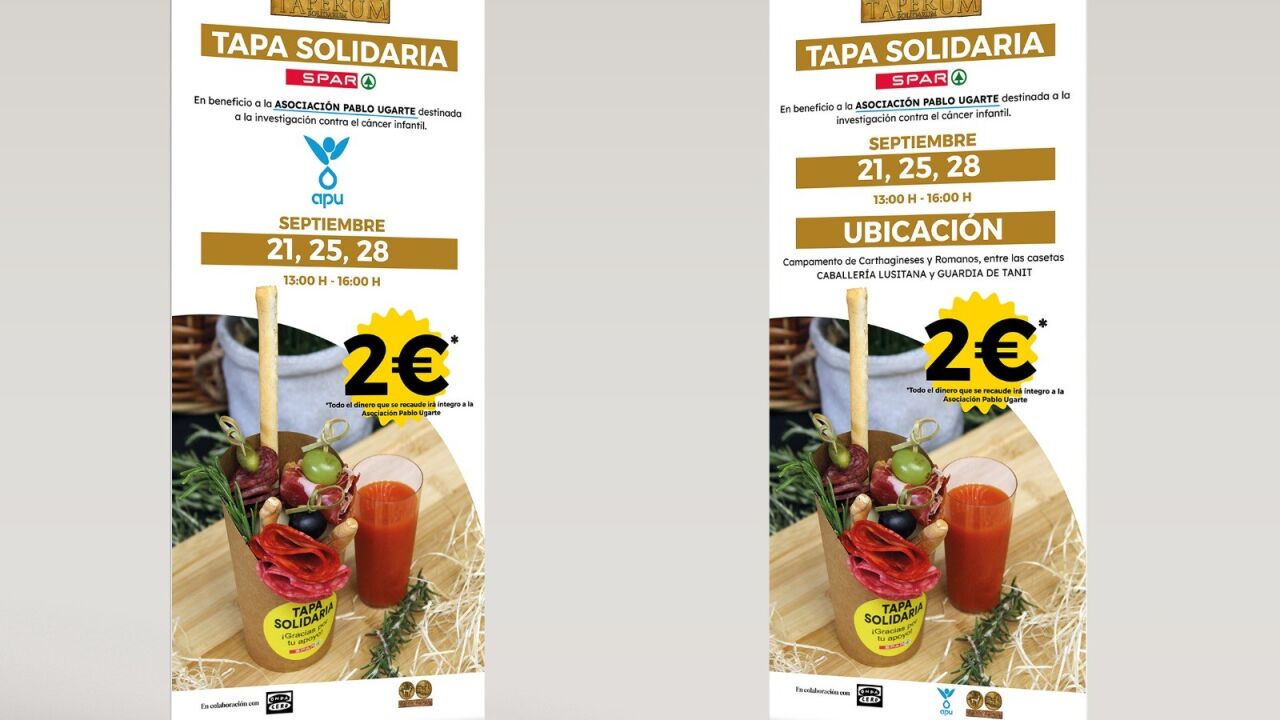 La Asociación Pablo Ugarte (APU), sin ánimo de lucro lleva desde 2010 luchando contra el cáncer infantil y este año de una forma especial en el campamento festero, entre las casetas Caballería Lusitana y Guardia de Tanit, se va vender una "Tapa Solidaria", al precio de 2 euros. El dinero íntegramente irá destinado a la APU, gracias a la implicación de SPAR y esta casa Onda Cero