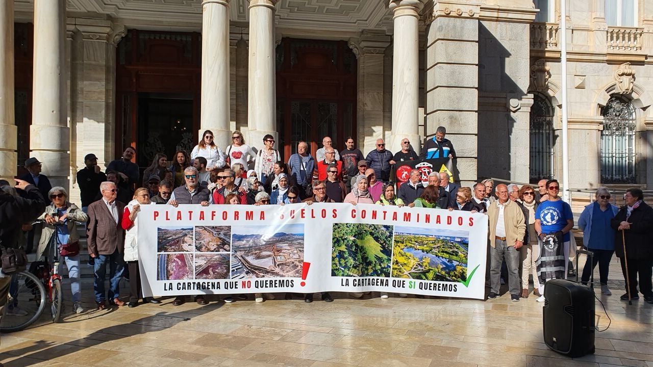 Cerca de un centenar de personas de la Plataforma contra la contaminación se manifestaban esta mañana a las puertas del Ayuntamiento durante el transcurso de un Pleno en el que todos los grupos han aprobado una declaración a favor de la descontaminación de suelos en Cartagena, un acuerdo del que los propios manifestantes dudan de su cumplimiento tras 24 años de espera.