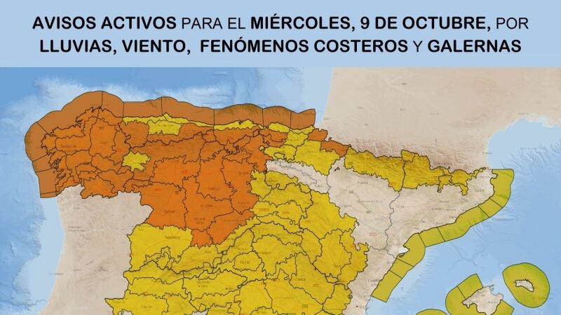 AEMET prevé para este miércoles cielos muy nubosos o cubiertos, tendiendo a intervalos de nubes medias y bajas al final. Probables brumas y nieblas matinales en el Pirineo. Lluvias débiles y chubascos que se generalizan e intensifican a primeras horas de la tarde, cuando podrían ser localmente fuertes e ir acompañados de tormentas ocasionales.