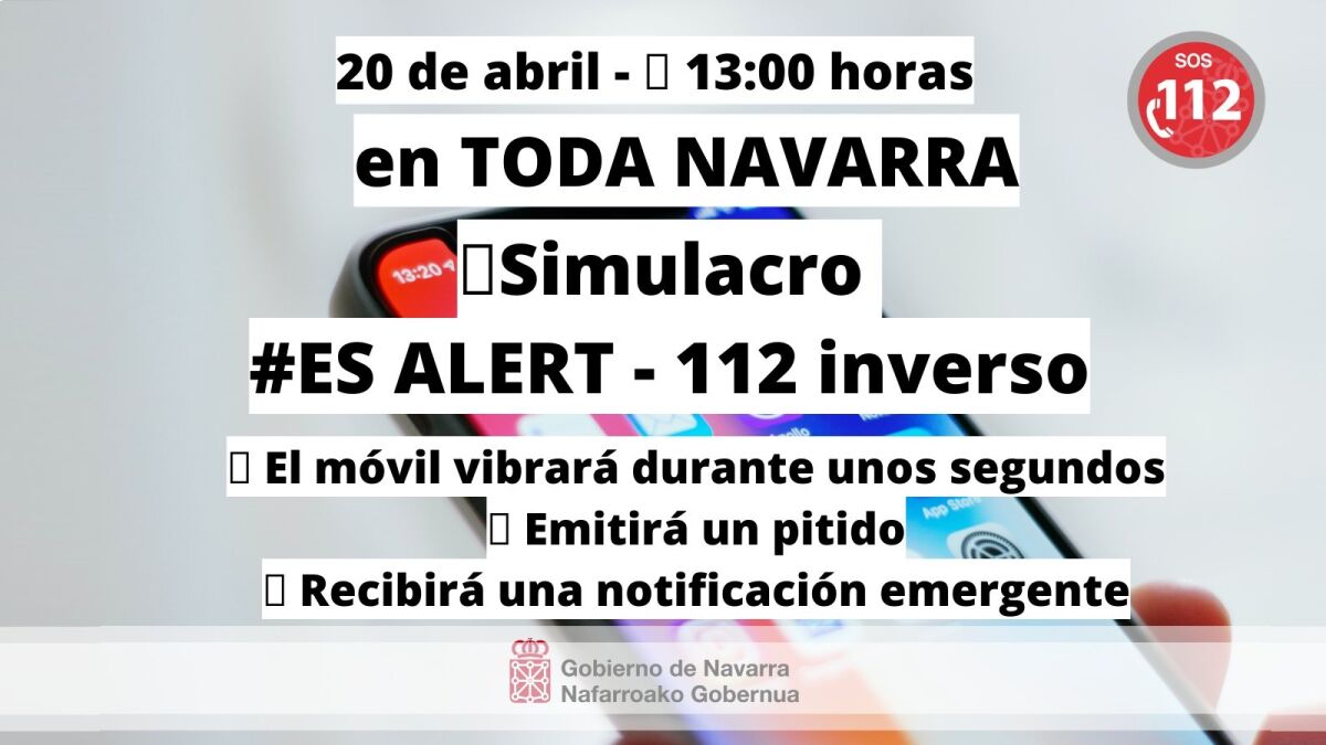 Según han informado desde SOS Navarra, la prueba tendrá lugar a las 13 horas en todo el territorio de la Comunidad foral. Todos los smartphones conectados a la red de telefonía en Navarra recibirán una notificación, acompañada de un pitido y una vibración. El texto indicará que se trata de un envío de prueba. Deberá pulsarse el botón de 'aceptar' y no se deberá llamar al 112 ni realizar ninguna acción.