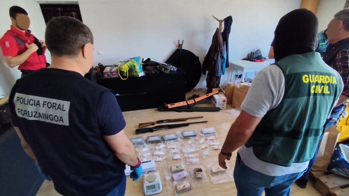 Días después era detenido en Tudela otro de los miembros de la organización, cuya misión era la de distribuir la cocaína en la Ribera de Navarra y zonas limítrofes. Fruto de las averiguaciones se realizaba el registro judicial de una nave en la que se incautaron 7 kg de cocaína, 43.000 euro en metálico, dos vehículos de alta gama y dos escopetas (foto anterior). Finalmente, dos personas más fueron detenidas en Imárcoain y Corella, con menor peso dentro de la trama.