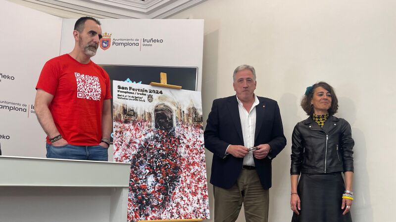El alcalde de Pamplona, Joseba Asiron, la concejala delegada de Cultura, Fiestas, Educación y Deporte, Maider Beloki, y el propio autor de la obra ganadora han desvelado esta mañana el cartel que anunciará los Sanfermines 2024. No es la primera vez que Ángel Blanco Egoskozabal vive el momento, pues ya ganó el concurso en 2009 con un cartel ambientado también en el Chupinazo y elaborado con una técnica similar. Como ganador del concurso, además de la repercusión nacional e internacional de su obra, se embolsará los 6.000 euros del premio.