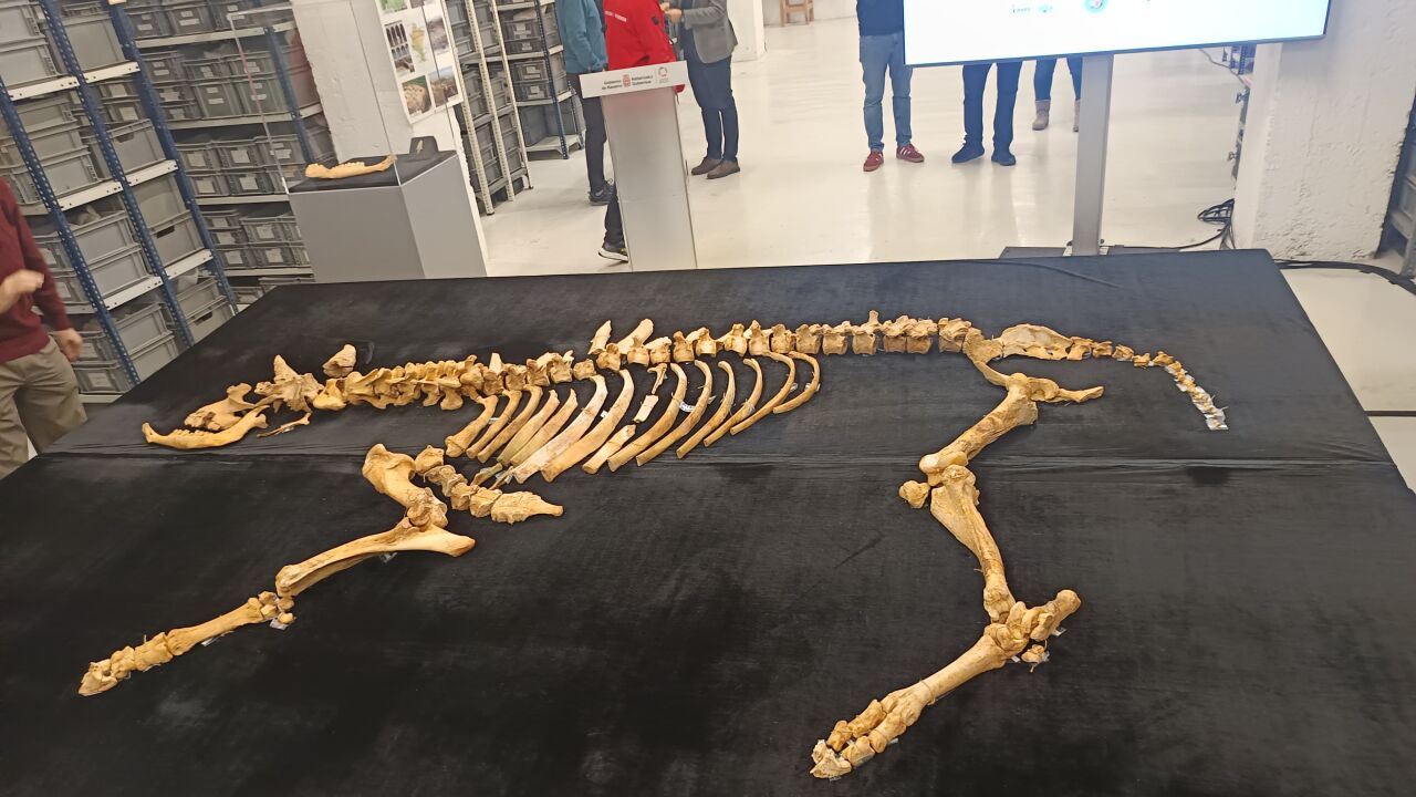 El Gobierno de Navarra ha dado a conocer hoy los restos de un esqueleto casi completo de un bisonte de hace 4.000 años descubierto en la Sima Arrafela, dentro del Parque Natural de Urbasa y Andía. En la misma intervención se han encontrado restos de un león de las cavernas, especie extinta hace aproximadamente 12.000 años, el tercero documentado en la Comunidad Foral. La investigación comenzó en 2024, después de que los investigadores confirmaran que los restos no eran de bóvido común. La recuperación se produjo en octubre del año pasado. Tomando como referencia las muelas del juicio, han calculado que el bisonte podría tener unos 4 años de edad, aproximadamente. Su peso podría haber sido de unos 800-850 kilos. La presidenta del Gobierno de Navarra, María Chivite, ha valorado las "muy buenas sorpresas" que está dando la arqueología en Navarra, a cuyo antepasado cazador o cazadora que intentó batir con su flecha a este bisonte ha dado las gracias porque "nos ha dejado un legado histórico de grandísima importancia".