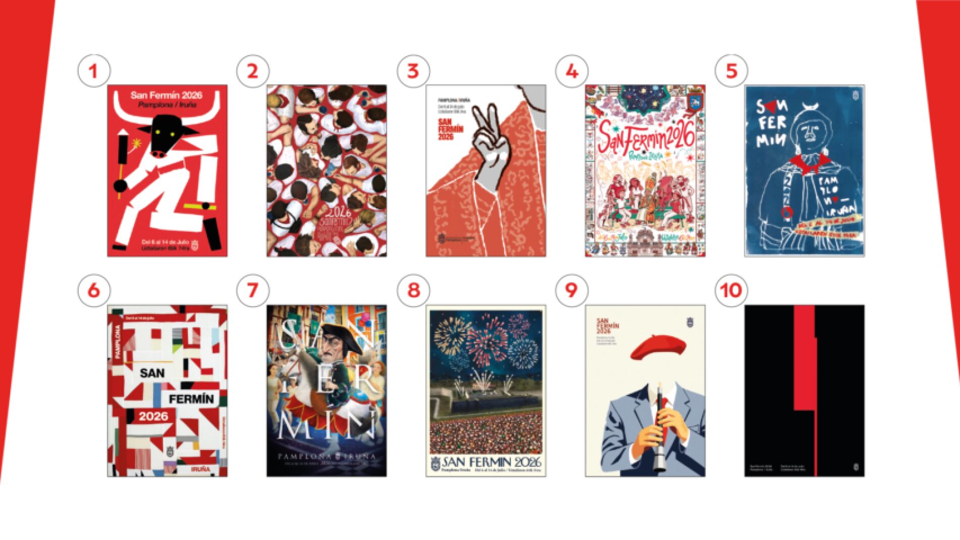 Las personas empadronadas en Pamplona ya pueden votar el cartel anunciador de San Fermín 2026. Cuando faltan poco más de dos meses para el inicio de las fiestas, ya se conocen los diez carteles seleccionados por el jurado técnico, entre los 488 presentados. Las diez propuestas, todas diferentes, se pueden visitar en el Palacio del Condestable y están disponibles en las páginas web www.pamplona.es y www.pamplonaescultura.es. Una de las diez propuestas será la ganadora, tras la votación popular, y además de anunciar las fiestas de San Fermín, recibirá un premio de 5.000 euros. Los nueve trabajos restantes recibirán su correspondiente accésit de 500 euros, en concepto del trabajo dedicado a la participación en la fase final del certamen.