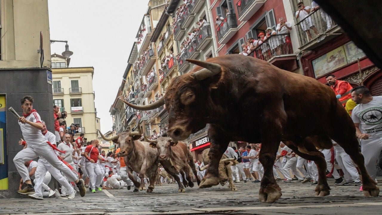 Prácticamente desde el primer tramo del encierro, este toro negro, de nombre Farfonillo y 555 kilos de peso, ha imprimido un ritmo impetuoso a la carrera, primero acompañado de un hermano colorado, que ha caído al suelo en la curva de Mercaderes. Los toros de la ganadería gaditana han tardado dos minutos y veintiún segundos en completar el recorrido entre los corrales de Santo Domingo y la plaza de toros de Pamplona.
