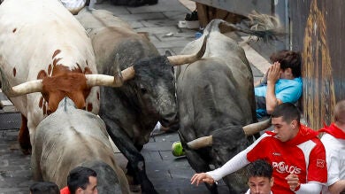 En la subida de esta recta la manada se ha ido estirando lo que ha permitido a algunos corredores tener la oportunidad de correr al lado de los toros. El recorrido de la Estafeta tampoco ha estado exento de los tropiezos de los mozos que, tirados en el suelo, han visto como la manada les pasaba por encima.