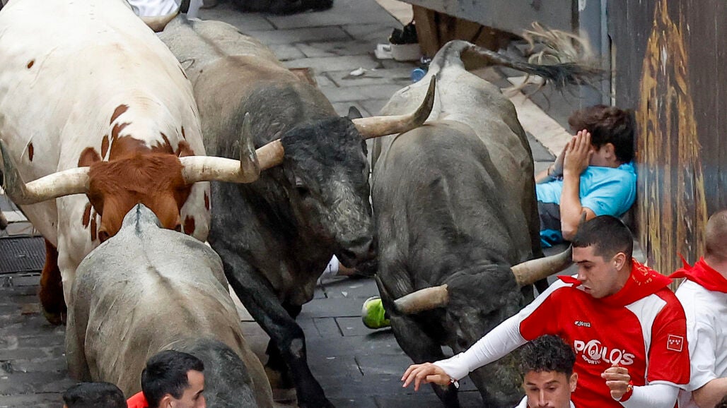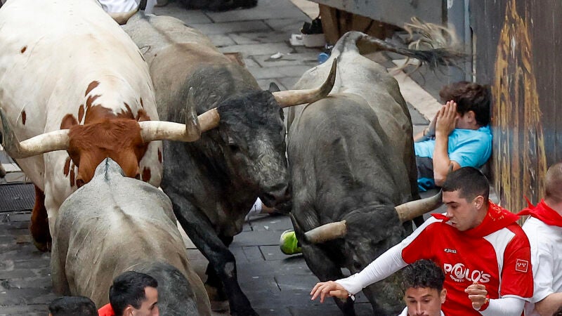 En la curva de Mercaderes se ha producido uno de los momentos de peligro al quedar varios mozos atrapados entre la pared y las reses en la parte izquierda del recorrido con el inicio de Estafeta. Un mozo con camiseta azul, caído en el suelo, se ha protegido mientras los astados han pasado de largo.