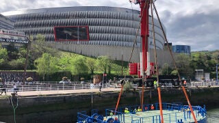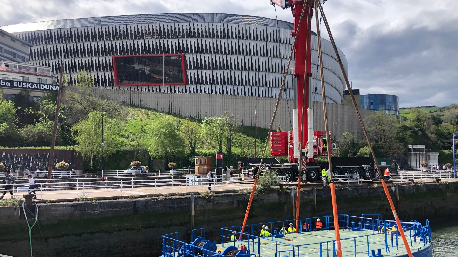 Tras horas de retraso y preocupación con el fuerte viento, la gabarra ya flota en la ría de Bilbao. 80 toneladas de embarcación levantada por dos grúas que surcará el Nervión este próximo jueves 11. Saldrá a las 16:30 desde el Real Club Marítimo del Abra en Getxo para llegar dos horas después al Ayuntamiento de Bilbao. La hora prevista de llegada al consistorio es sobre las 18.30. La embarcación no podrá superar los 4 nudos de velocidad.