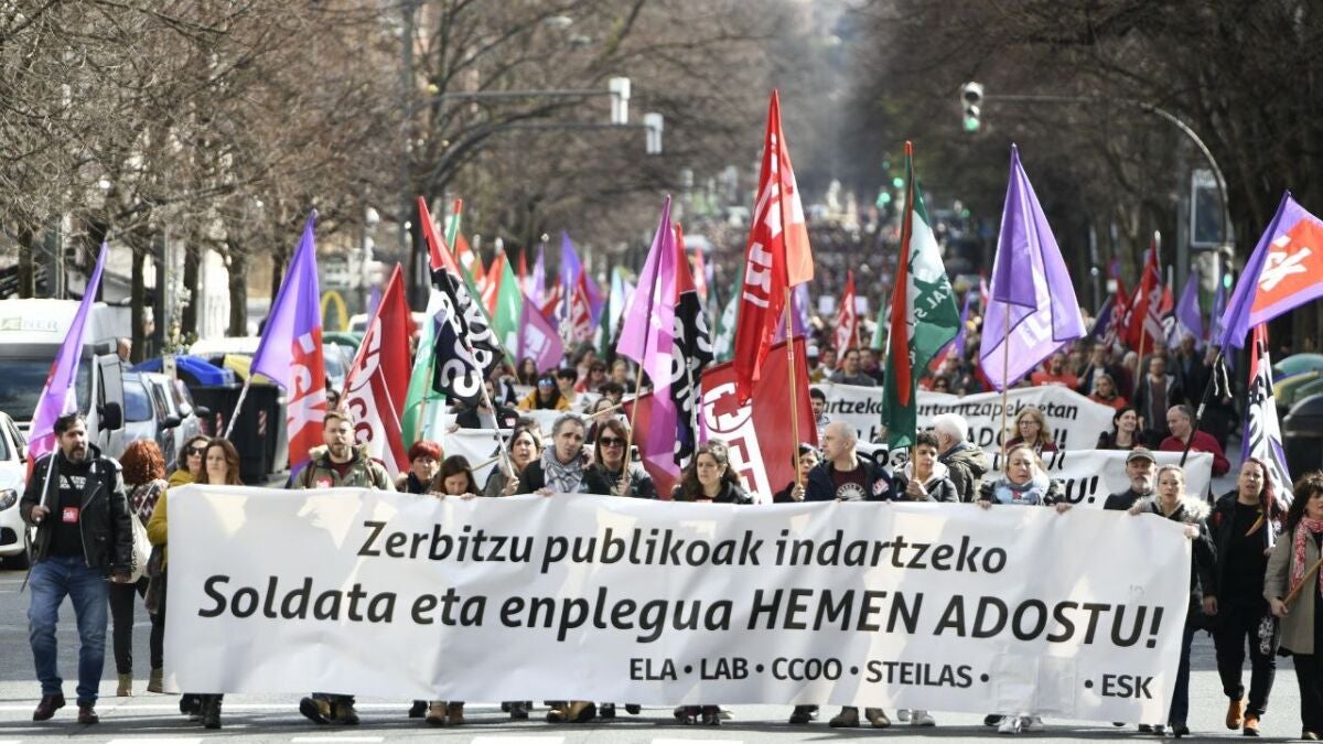 Tercera jornada de huelga en el sector público de Euskadi, a la que están llamados a participar hasta 160.000 personas de toda la geografía vasca. Sin embargo, pese a que los sindicatos hablan de "éxito", sobre todo atendiendo a los 30.000 trabajadores que se han manifestado en las tres capitales vascas, desde el Gobierno Vasco se habla de un seguimiento dispar. Osakidetza ha cifrado el seguimiento de la huelga entre los sanitarios por debajo del 5%. En sectores como la educación o los transportes, se ha notado más el apoyo a los paros. Las centrales cifran el seguimiento entre profesores y personal docente en un 65%.