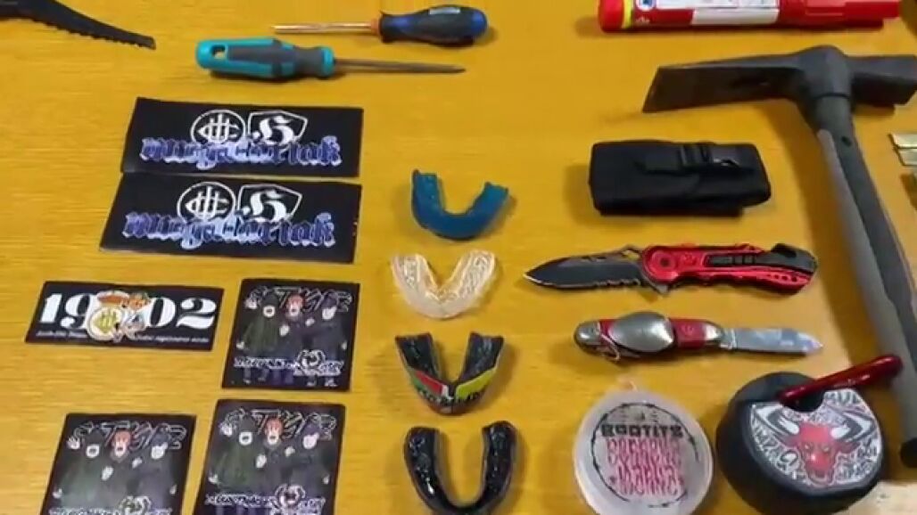 Patrullas de la Ertzaintza realizaron identificaciones y cacheos en el que se ha ocupado, al menos: 15 bastones de golf, una barra metálica, 3 piolets, 4 protectores bucales, dos pares de nudillos metálicos, un cuchillo, dos navajas, un bastón extensible, varios destornilladores, un martillo, una bengala, así como, dos railes de cajón, tres bisagras metálicas, varios pasamontañas y guantes, etc.