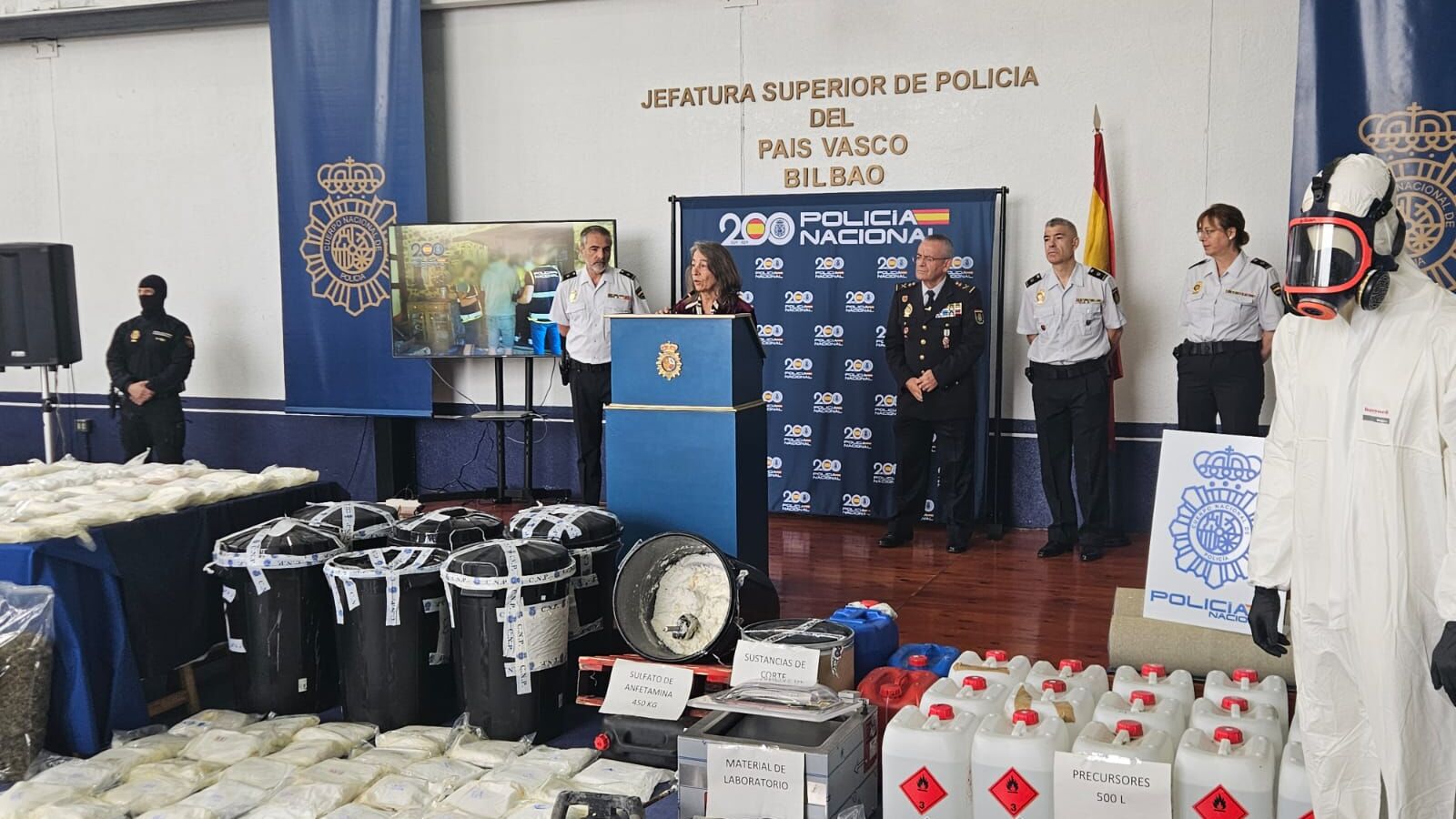 La Policía Nacional ha mostrado ante los medios el material incautado en el marco de la Operación Polaris, "uno de los mayores alijos de 'speed'", formado por 450 kilogramos de esta sustancia, además de 500 litros de precursores, 140 plantas de marihuana, 10 kg de cogollos, 7.500 euros en efectivo, cinco vehículos y un arma larga, además de los enseres utilizados en el laboratorio para la producción. Se estima que en la venta al pormenor de la sustancia alcanzaría un valor de 14 millones de euros.