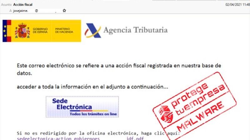 Según ha explicado Incibe, existe una alerta de importancia 'Alta' (cuatro sobre cinco) en la que cualquier persona que haya recibido el correo malicioso puede verse infectado por el 'malware'. El email tiene el asunto 'Acción fiscal' por parte de un remitente que suplanta la identidad de la Agencia Tributaria aprovechando el inicio de la campaña de la declaración de la renta.