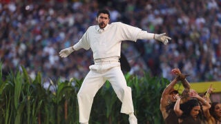 Desde su aparición inicial, Benito Antonio Martínez Ocasio dejó claro el tono del espectáculo. Vestido de blanco y presentándose con su nombre real, el artista arrancó con 'Tití Me Preguntó', dando inicio una sucesión de algunos de sus mayores éxitos que incluyó temas como 'Yo Perreo Sola', 'Safaera', 'El Apagón' o 'Lo que le pasó a Hawaii'. El show se desarrolló como un viaje visual y sonoro por su universo artístico, con una puesta en escena que transformó el campo de juego en una recreación simbólica de Puerto Rico, con elementos culturales y referencias al paisaje urbano y rural de la isla.