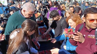 En plena temporada de la fresa, los agricultores han querido poner en valor este producto, sobre todo después de la alerta alimentaria que saltó la semana pasada por las fresas procedentes de Marruecos que podían provocar hepatitis A. La organización agraria Unión de Pequeños Agricultores (UPA) han repartido esta mañana en plena Puerta del Sol dos mil cajas de fresas de Huelva de medio quilo cada una a los ciudadanos que se han acercado hasta el centro de la capital. Un reparto de fresas que ya tuvo la ciudad de Sevilla la semana pasada como principal escenario y que trasladarán el próximo 4 de abril a las puertas del Parlamento Europeo, en Bruselas.
