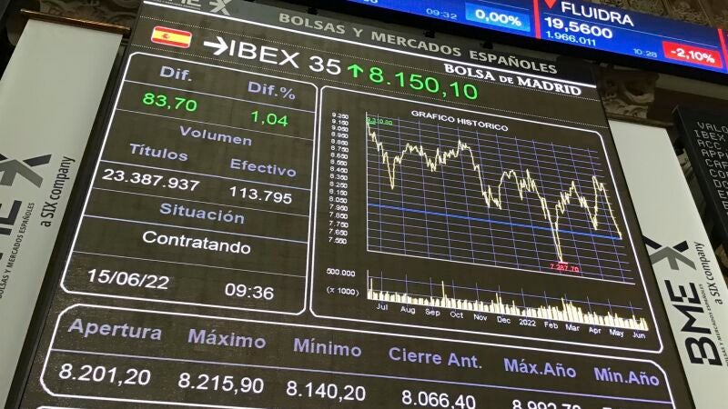 La bolsa española ha bajado este jueves el 1,18 % y ha terminado por debajo de 8.100 puntos afectada por la caída de las plazas internacionales por el temor de los inversores a que las subidas de los tipos de interés provoquen una recesión, según datos del mercado.