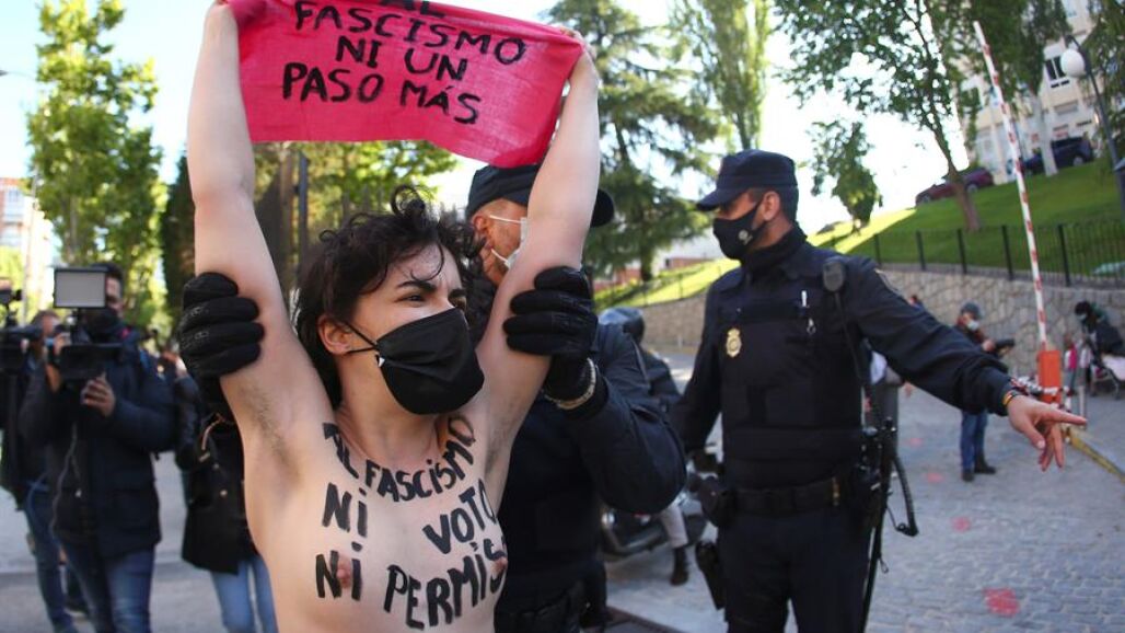 Pasadas las 9:30h, un total de ocho mujeres, con el torso desnudo –seña de identidad de la formación ucraniana– y pintado con lemas en contra del fascismo, se han acercado al centro escolar de la calle Padre Damián, cerca del Santiago Bernabéu, portandopancartas en las que se leía "A los fascistas, ni un paso más" o "Al fascismo, ni voto ni permiso", consignas que también han gritado durante su paso.
