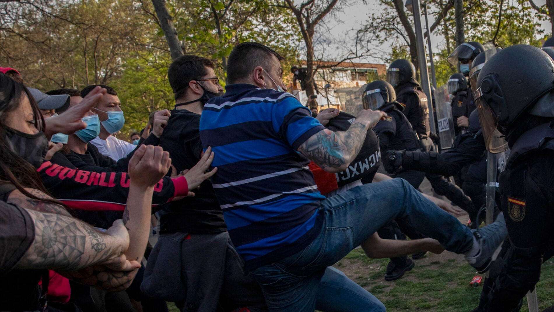 La jornada finalizó con duros enfrentamientos con la Policía y varios detenidos, entre los que se encuentran Alberto R. R., de 44 años y Daniel J. J., de 32 años, ambos relacionados con la formación de Pablo Iglesias.