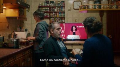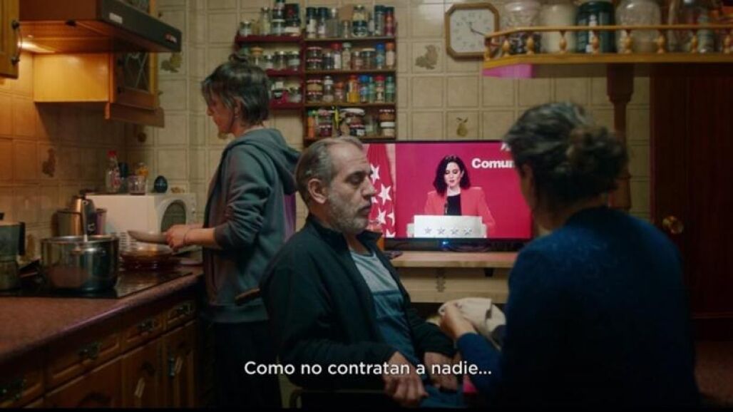 Su hermana dobla el turno en el hospital porque "no contratan a nadie". Mientras su madre se lamenta con "es lo que hay y no sabemos lo que vamos a hacer", y se ve en la televisión a la presidenta regional, Isabel Díaz Ayuso, hablar de la okupación, de la crisis y de las huelgas en el hospital Zendal, la protagonista responde a su progenitora que la respuesta a sus problemas es "votar por quien quiere cambiar las cosas".