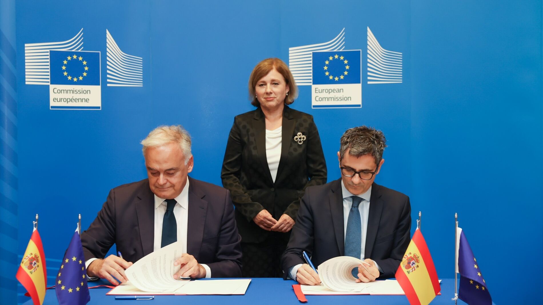 Ambos rubricaron juntos ante las cámaras el pacto que tanto ha tardado en llegar, pero comparecieron separados para explicarlo a la prensa en compañía de la vicepresidenta comunitaria de Valores y Transparencia, Vera Jourová.