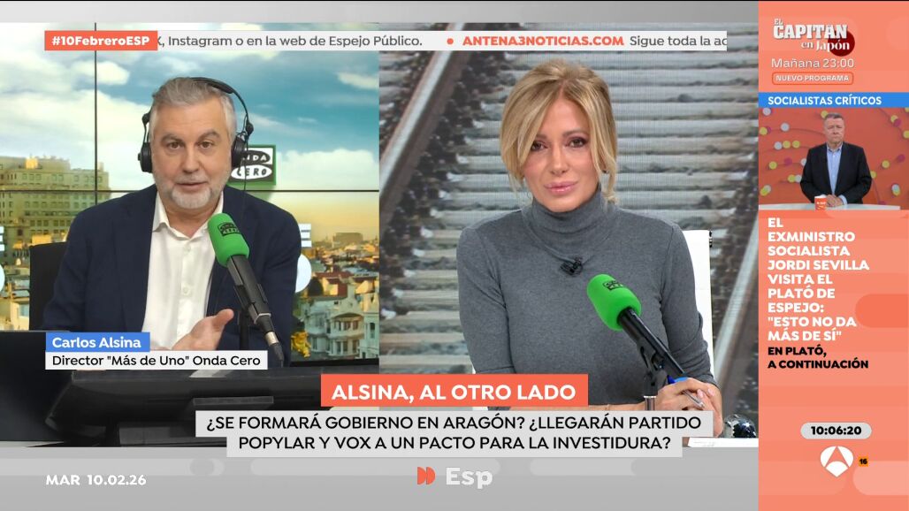 Como cada martes, Más de uno y Espejo Público han conectado sus emisiones para que Susanna Griso y Carlos Alsina analicen la actualidad política. Susanna ha comenzado la conversación señalando que los aplausos de ayer en Génova celebrando la victoria de Jorge Azcón en las elecciones de Aragón fueron "un poco forzados". Alsina ha asegurado que cree que, en su fuero interno, el líder popular está decepcionado. "No le ha salido la jugada", ha añadido, aludiendo a la pérdida de dos escaños que ha experimentado el PP a pesar de su victoria.