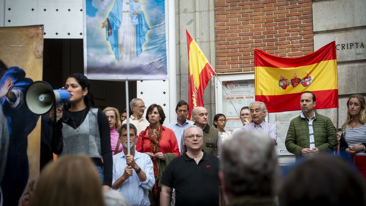 Como viene siendo habitual desde hace meses, un grupo de personas se han acercado a la intersección entre las madrileñas calles de Ferraz y Marqués de Urquijo, frente a la iglesia del Inmaculado Corazón de María, para rezar el rosario y protestar por la ley de amnistía, que ya ha sido aprobada en el Congreso y solo falta que sea publicada en el Boletín Oficial del Estado (BOE).