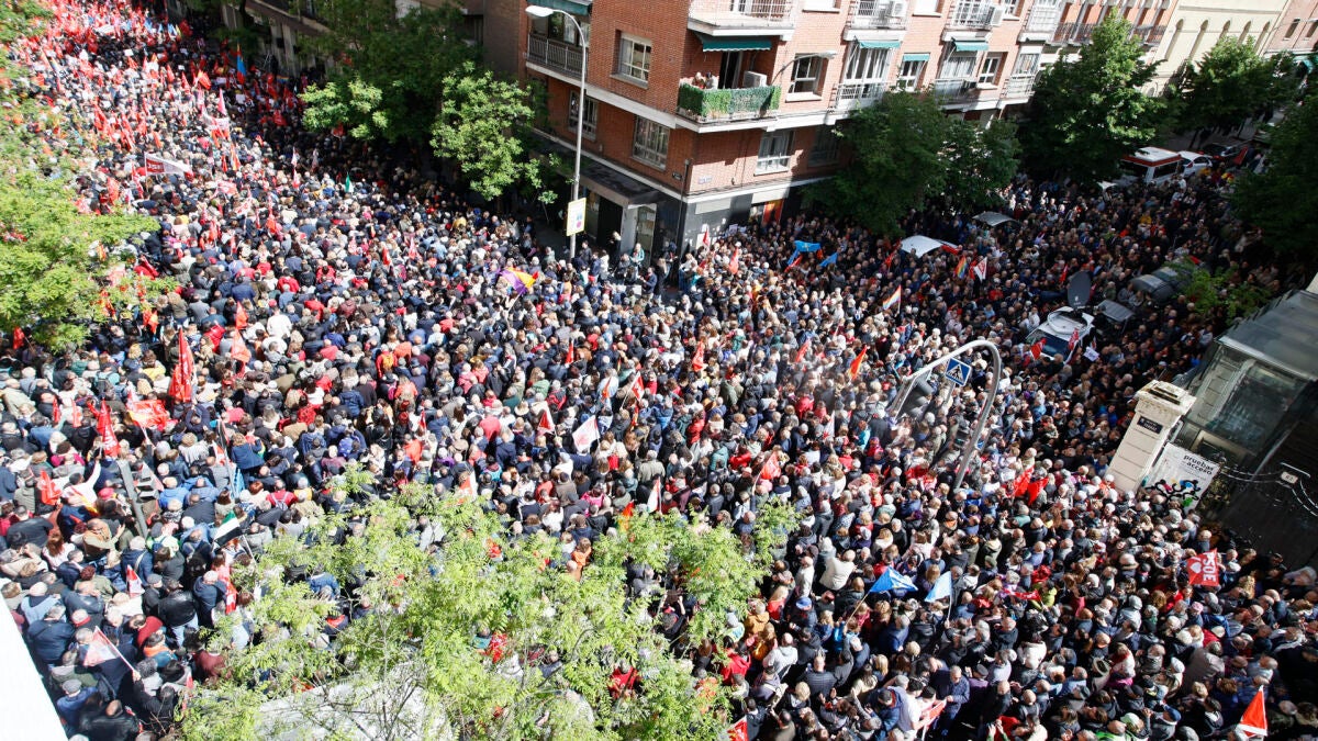 Unos 10.000 simpatizantes y militantes del PSOE se han congregado esta mañana ante la sede central del partido en la calle de Ferraz, en Madrid, para respaldar a su líder, Pedro Sánchez, y pedirle que no deje la presidencia del Gobierno, han informado fuentes socialistas.