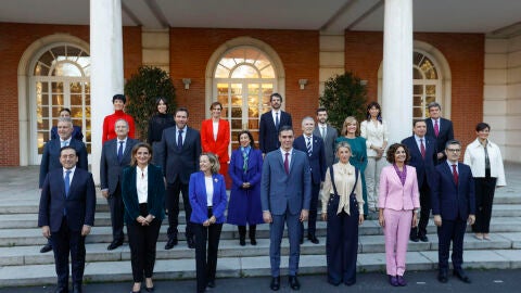 En torno a las 9.15 horas de la mañana de este miércoles, los 22 ministros de la nueva legislatura han ido llegando al Palacio de la Moncloa, donde se han realizado la tradicional foto de familia con todo el Ejecutivo en las escalinatas del edificio del Consejo.