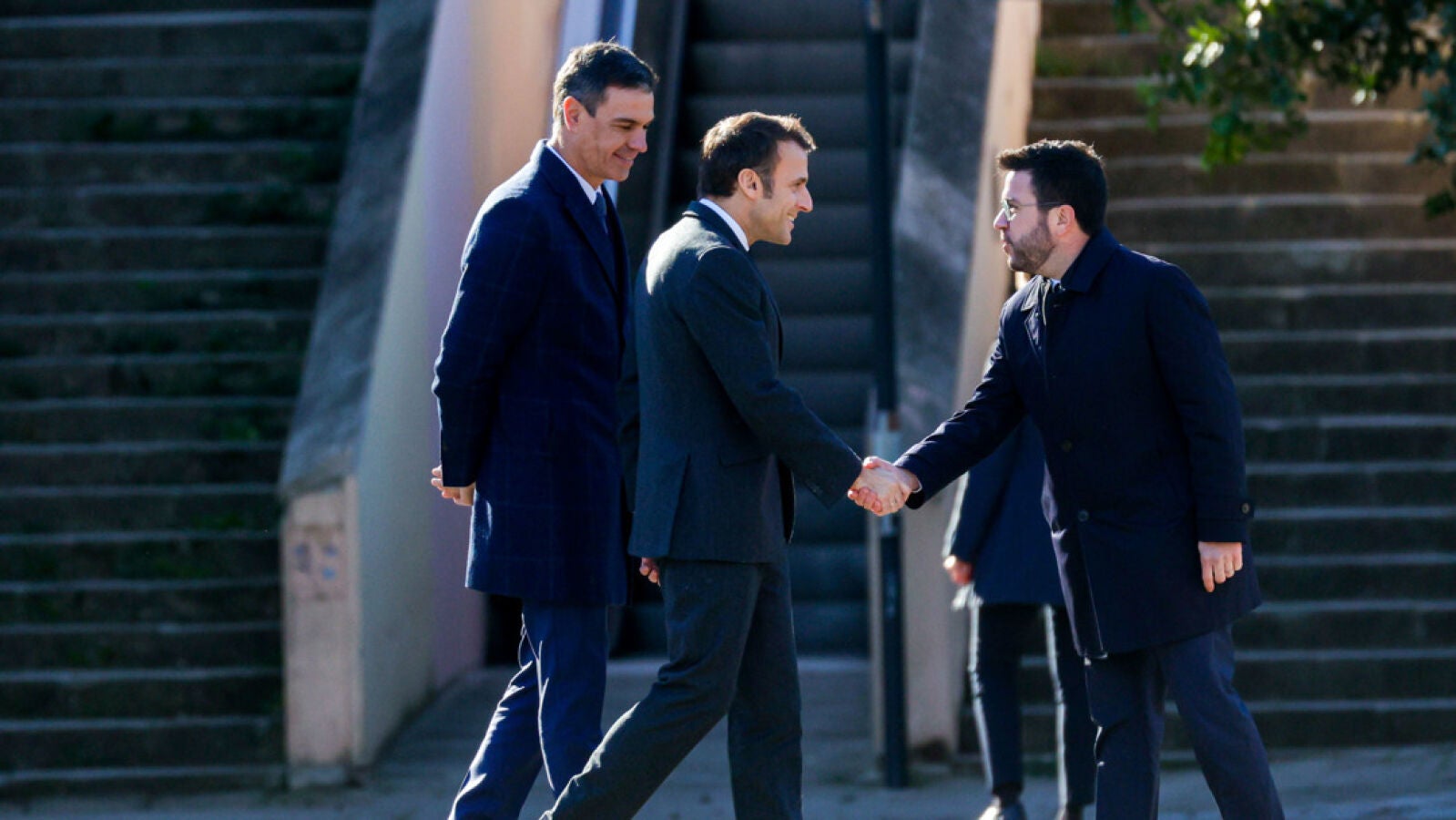 En el momento del saludo a Macron, Aragonès estaba acompañado del propio Sánchez, de la delegada del Gobierno en Catalunya, Maria Eugènia Gay; la alcaldesa de Barcelona, Ada Colau; la presidenta de la Diputación de Barcelona, Núria Marín, y el jefe de la Inspección General del Ejército, el teniente general Manuel Busquier.