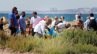 Botellas de plástico, trozos de bolsas de patatas, latas y colillas han sido algunos de los residuos que la Reina ha recogido en una jornada casi veraniega en la que han participado más de varias decenas de voluntarios del Proyecto y de Cruz Roja. Durante el recorrido, doña Sofía ha sido animada por decenas de bañistas que aplaudían la iniciativa coincidente con el día internacional de Limpieza de Playas (World Clean Up Day).